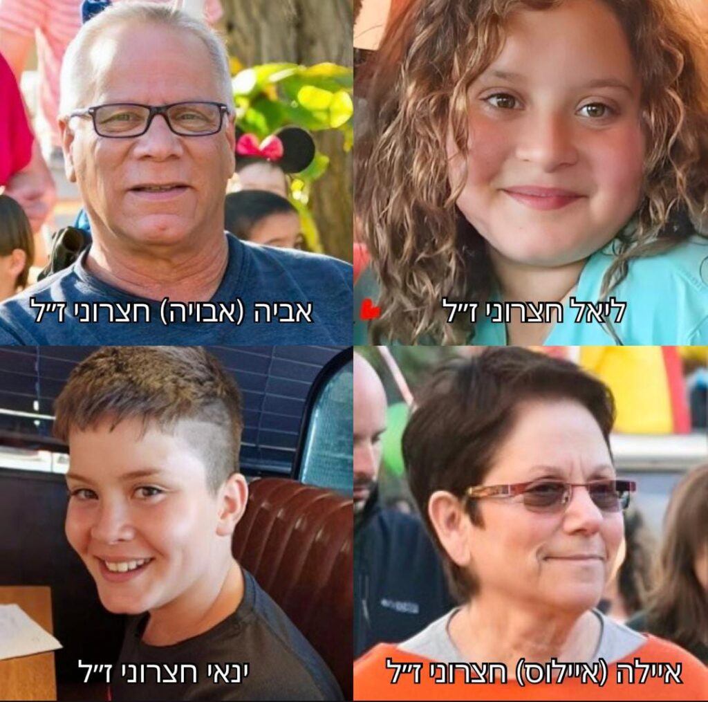 במתקפת הטרור האכזרית של 7 באוקטובר 2023 בקיבוץ בארי, נרצחו אביה חצרוני, נכדיו האהובים בני ה־12 ינאי וליאל, ואחותו איילה – יחד עם רבים מתושבי הקיבוץ.